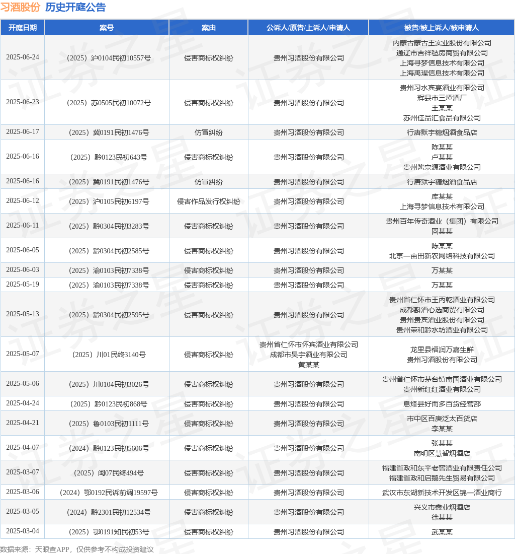 案号:(2025)黔0304民初2595号审理法院:遵义市播州区人民法院案由:侵害商标权纠纷当事人信息: 原告/上诉人:贵州习酒股份有限公司 被告/被上诉人:贵州省仁怀市王丙乾酒业有限公司、成都斟酒心选商贸有限公司、贵州贵宾酒业股份有限公司、贵州荣和黔水坊酒业有限公司开庭日期:2025年5月13日根据统计,近一年内以贵州习酒股份有限公司为当事人的历史开庭公告有73则,其中案由为“侵害商标权纠纷”的公告以55则居首,其次为“不正当竞争纠纷”有8则,“仿冒纠纷”有2则。历史开庭公告(前20条)如下: