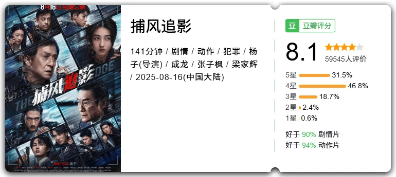 顶着外界先入为主的“烂片”质疑和刻板印象,《捕风追影》在点映期间口碑持续逆风上行,8月16日正式上映后,骰盅终于揭晓:作为档期唯一的国产硬核动作类型片,豆瓣8.1分,猫眼专业版预测票房10亿+,大概率将成为暑期档季军,年度票房第六。